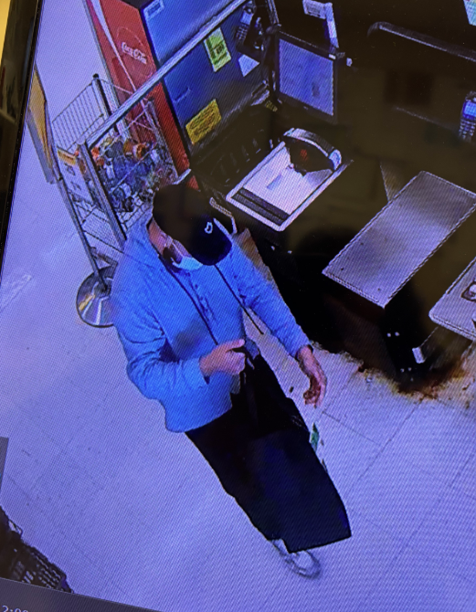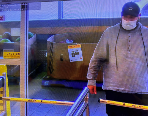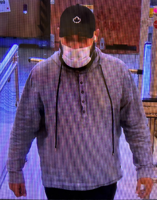 The suspect was seen on video entering and leaving the store where the unauthorized purchases were made. He was noted to be a white male with dark hair and a full beard. He was wearing a black ball cap, white face mask, grey hoodie and dark pants at the time of the offence.