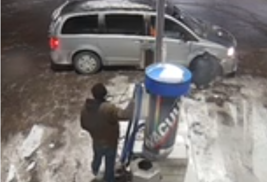 Between 0704 hours and 0714 hours, the original male in the brown jacket returned with another male party in a silver minivan. The driver of the vehicle pumps the tires while the male in the brown jacket used a tool on the vacuum to retrieve money from it.